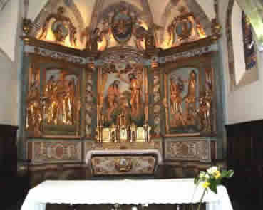 · Le Chur : il date de la fin du 14ème siècle avec un magnifique retable du 18ème siècle en bois sculpté et doré à la feuille d'or, représentant des scènes de l' Évangile concernant la vie de Jean-Baptiste, le patron de la paroisse :
